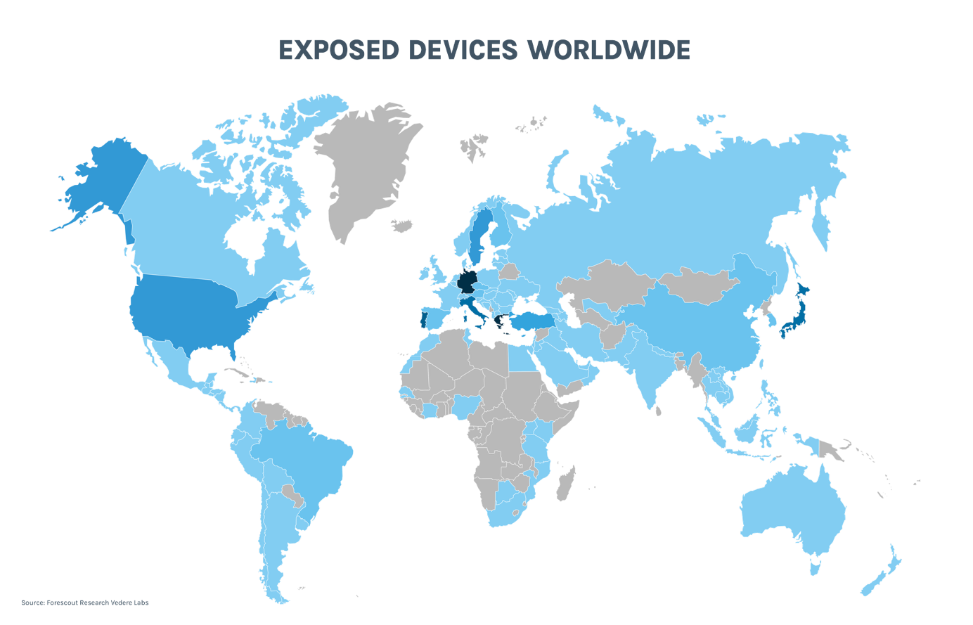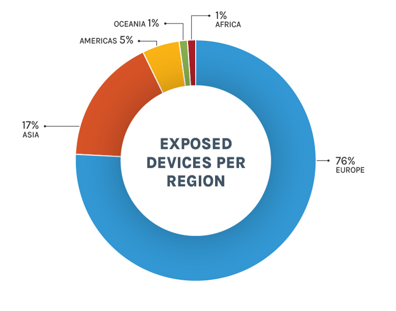 Dass Solarkomponenten frei aus dem Internet erreichbar sind, kommt in Europa und Asien wesentlich häufiger vor als in anderen Regionen. Auf Europa entfallen über drei Viertel der zugänglichen Geräte, gefolgt von Asien mit 17 %; die restlichen 8 % befinden sich in anderen Teilen der Welt. Auf Deutschland und Griechenland entfallen jeweils 20 % der weltweit gefundenen Geräte, gefolgt von Japan und Portugal mit jeweils 9 % sowie Italien mit 6 %. Die nachstehende Heatmap zeigt die weltweite Verteilung der Geräte.