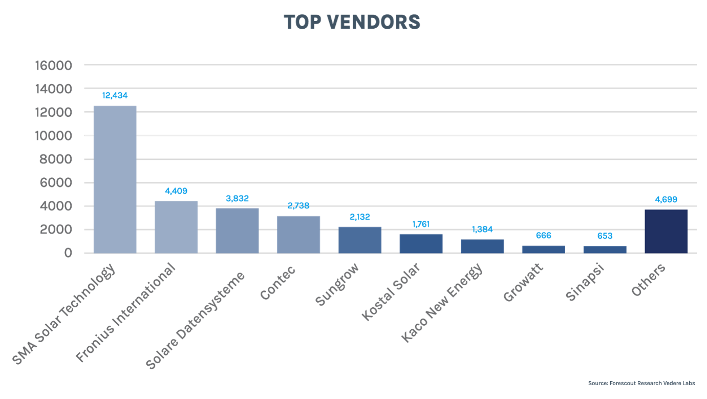 In der nachstehenden Abbildung sind die beliebtesten Hersteller aufgeführt. Abgesehen davon, dass auch die drei Anbieter, deren Solarsysteme der SUN:DOWN-Bericht behandelt (SMA, Sungrow und Growatt), in dieser Liste erscheinen, sind noch weitere interessante Fakten zu nennen: